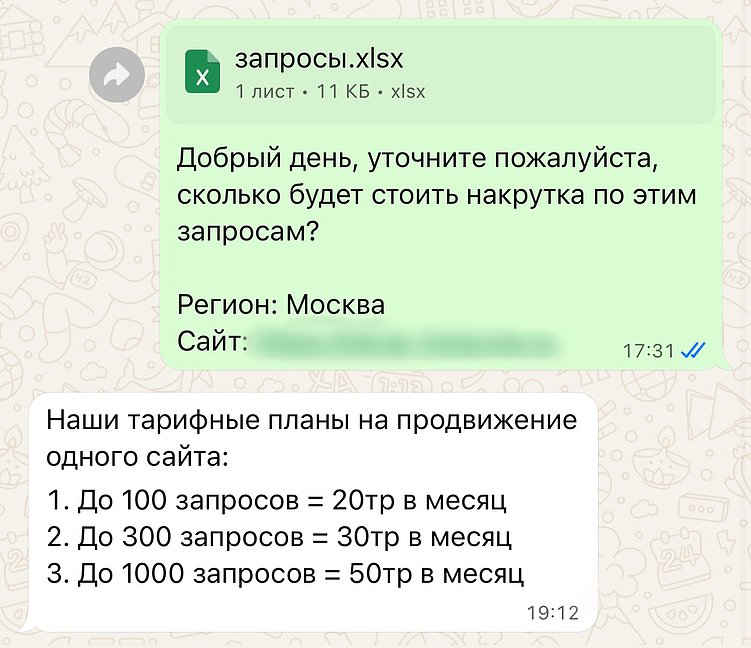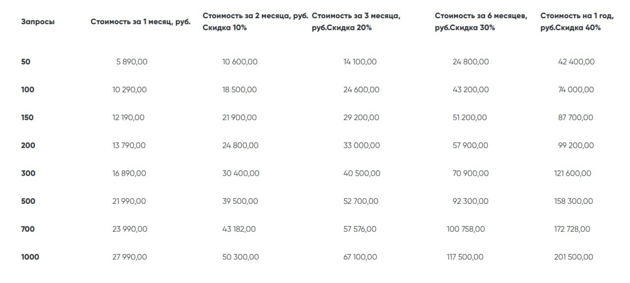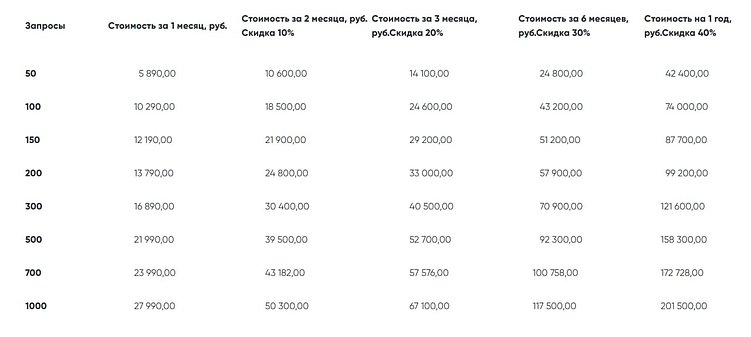 Выслала перечень из 101 запросов менеджеру с уточнением прайса, мне опустили стоимость до 20 тысяч за 100 запросов.
