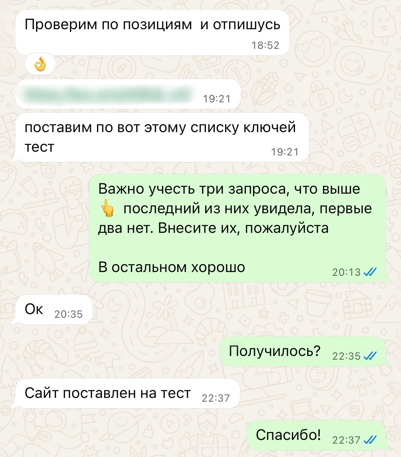 Менеджер сопровождал на протяжении всей работы, впрочем без него запуск теста был невозможен. Старался отвечать оперативно и подробно, шел навстречу. По запросам готов был проконсультировать, предложил для теста дополнить список до 10-15 ключевых фраз, но я остановилась на своих предложенных трех запросах