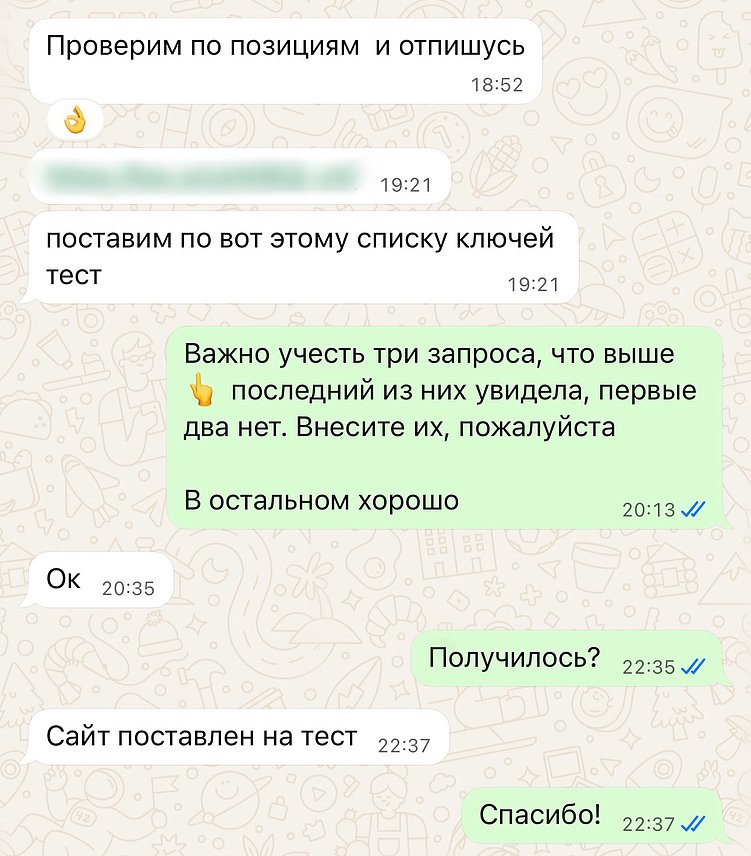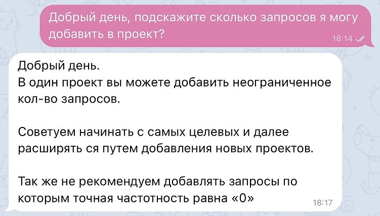Я попросила подождать с запуском теста, пока отбираю запросы. Менеджер предложил написать в чат, когда буду готова запускать его. Пока отредактировала запросы на сайте, бот прислал уведомление, что тест запущен. Это показалось странным, ведь я не отписалась менеджеру по готовности запуска.