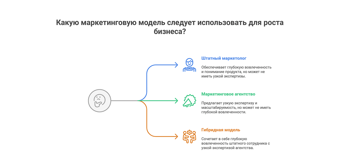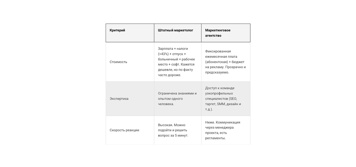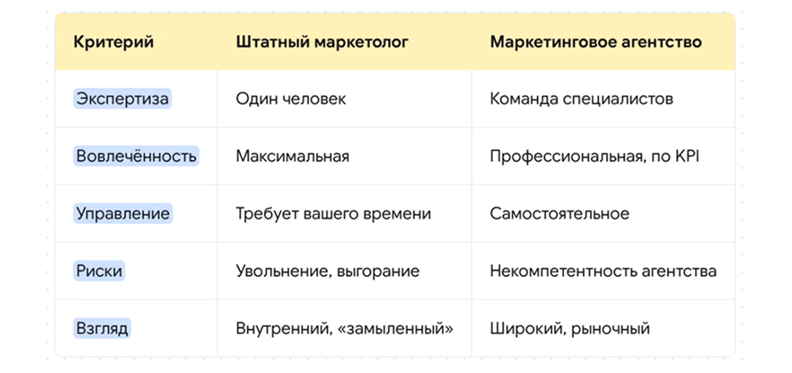 Не существует «плохого» или «хорошего» выбора. Штатный маркетолог может стать бесценным активом для одной компании и черной дырой для бюджета другой. Агентство может вывести бизнес на новый уровень или оказаться формальным исполнителем.
