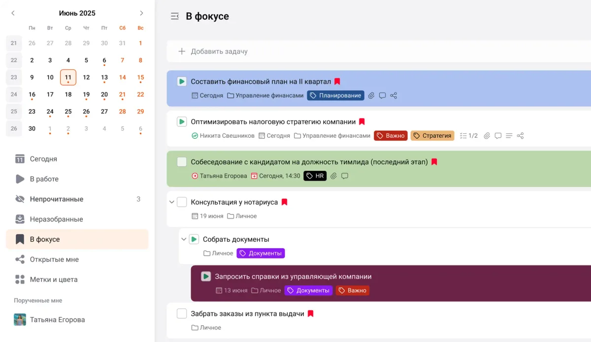 Когда начинаешь смотреть, как устроены процессы в командах наших клиентов, почти всегда оказывается, что половина договорённостей живёт в переписках, часть — в голове у руководителя, а все остальное теряется где-то на созвонах. В такой системе вы неизбежно становитесь центром, потому что только вы видите полную картину по всему бизнесу. Поэтому всё, что связано с задачами, статусами и ответственностью, должно жить в единой системе или таск-менеджере. В LeaderTask это решается через базовые вещи, которые на практике сильно меняют управление: каждая задача фиксируется с ответственным, сроком и понятным описанием результата; задачи можно разбивать на подзадачи и чек-листы; статусы показывают, на каком этапе работа; есть единый список задач по сотрудникам и проектам, где видно загрузку и прогресс.