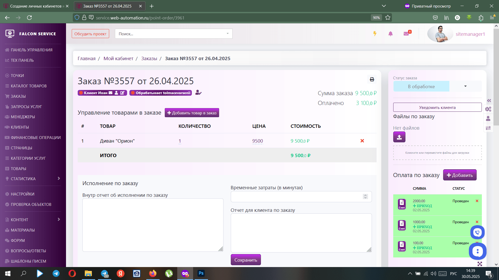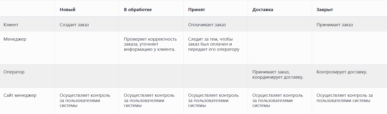 Каждый выполняет над заказом строго определенную функцию, не влезая в чужой огород. На странице заказа сотрудник имеет только те возможности, которые обусловлены его ролью и текущим статусом заказа.