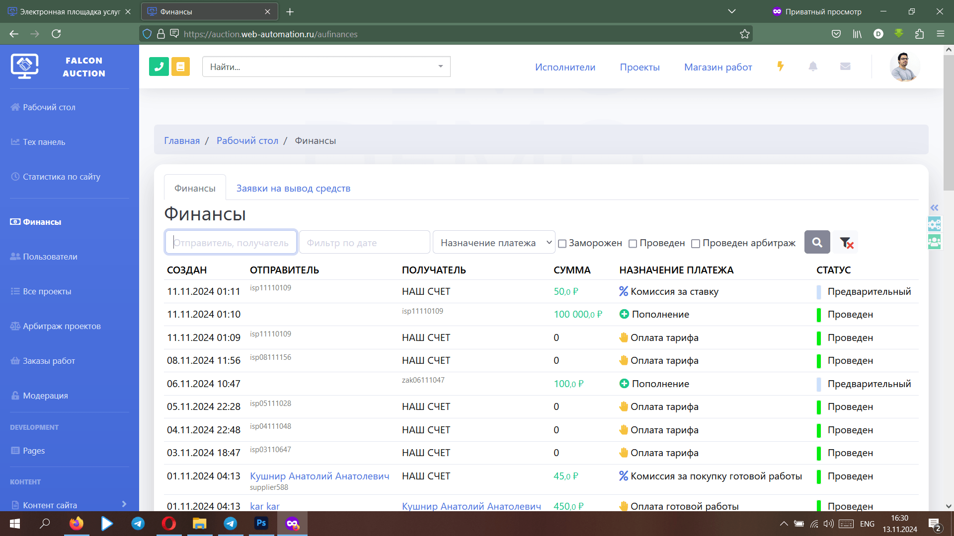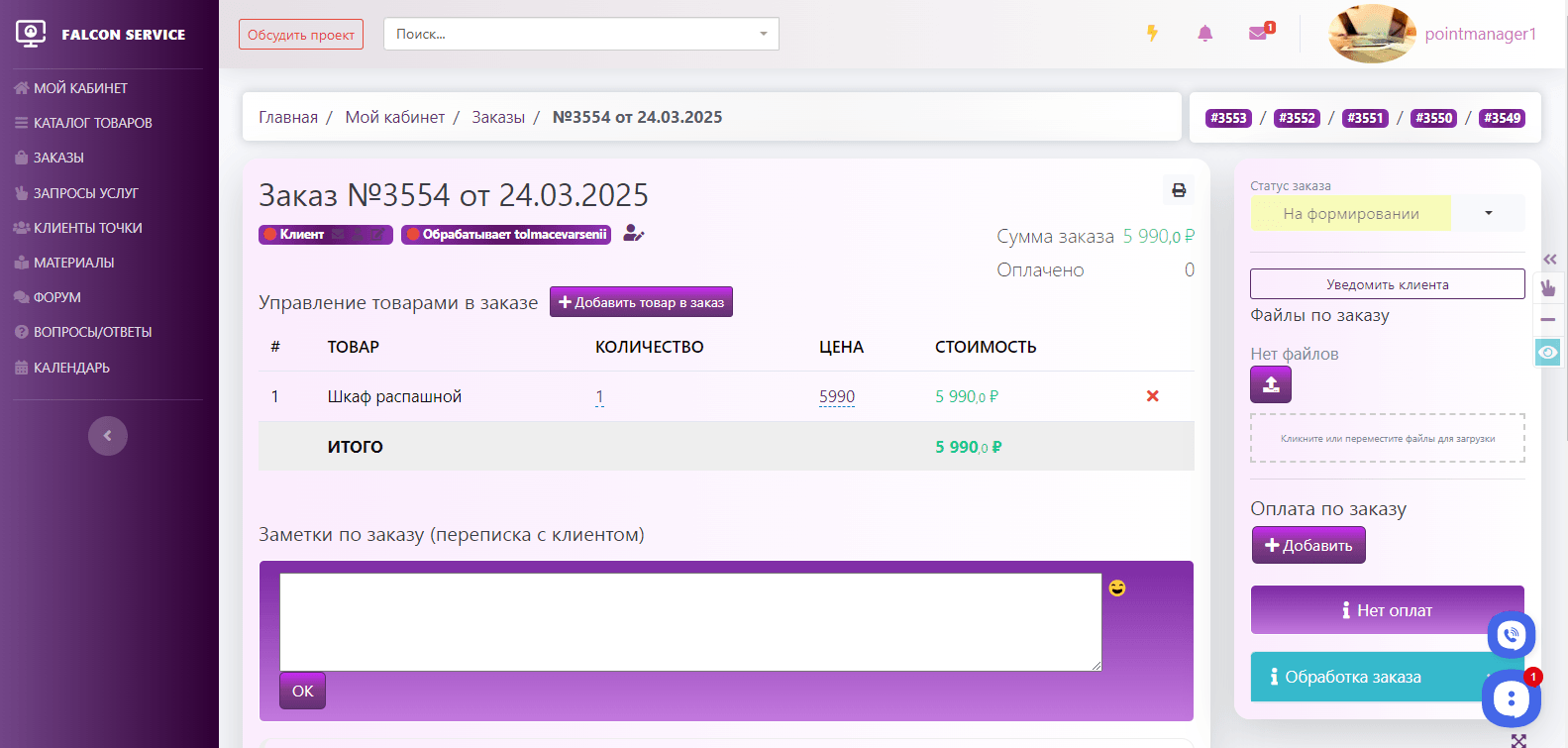 Далее он переходит в один из заказов, где может поменять статус, добавить документ, некие данные в поля или прокомментировать в чате текущее состояние по заказу.
