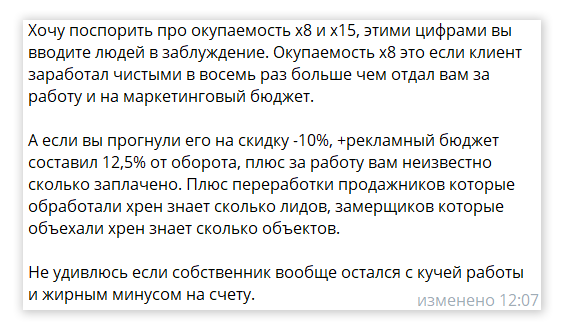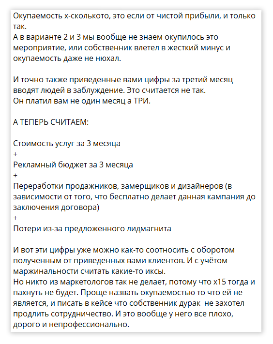 Комментарий подчеркивает важность учета всех затрат и правильного периода анализа. Если рентабельность у данного клиента выше 7%, то третий месяц для него точно был прибыльным. Мы согласны, что долгосрочные затраты и результаты тоже важны. Но также важна динамика с х8 до х15 за 3 месяца. Когда мы решаемся начать бегать, мы всегда начинаем с небольших дистанций в 1 км и наращиваем результаты постепенно. На большом отрезке мы можем увидеть, какой из нас получился бегун. Промежуточные результаты для нас же служат подтверждением, насколько нам подходит этот спорт. Получается ли бегать больше? Тренируется ли выносливость и дыхание? Не так ли?