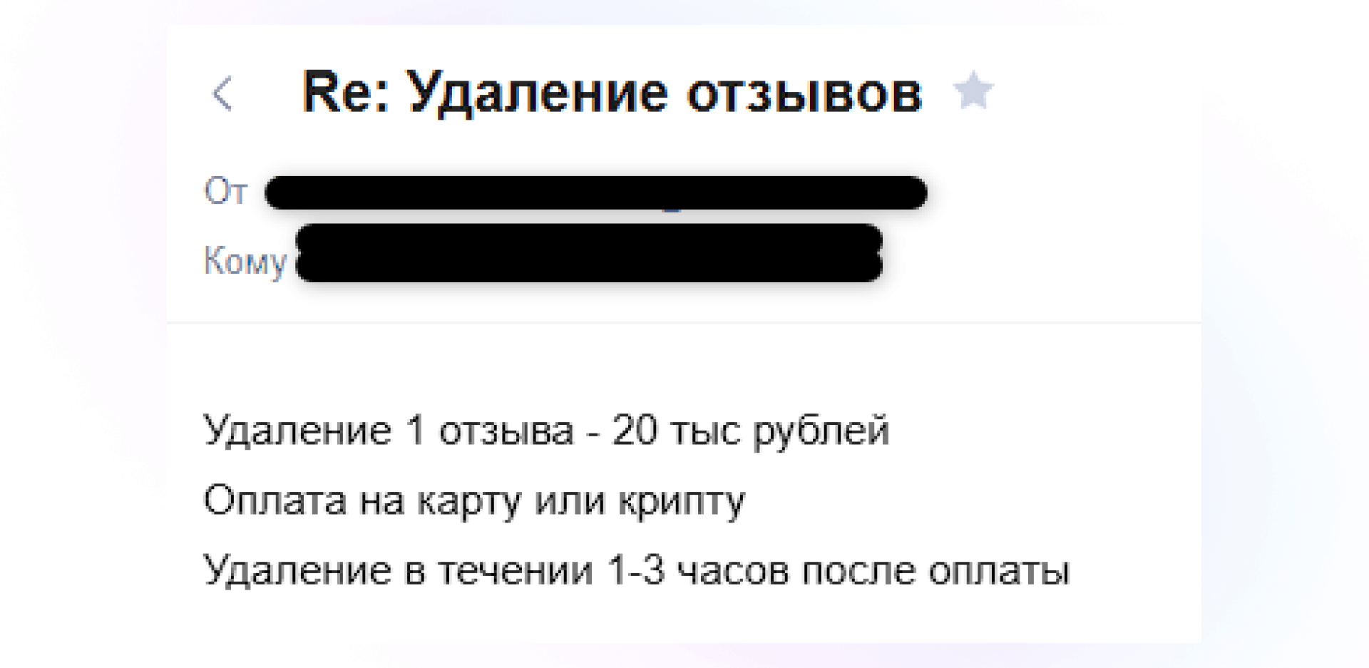 Нужно понимать, что отзовики-мошенники нацелены исключительно на высасывание денег за удаление негативных отзывов, которые зачастую они же сами и разместили.
