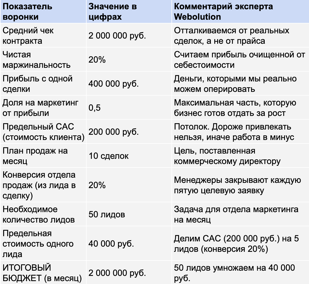 Именно поэтому эксперты агентства Webolution никогда не предлагают клиентам бюджет в процентах от прошлой выручки. Прошлая выручка уже мертва. Бюджет нужно считать от целевой стоимости привлечения нового контракта.