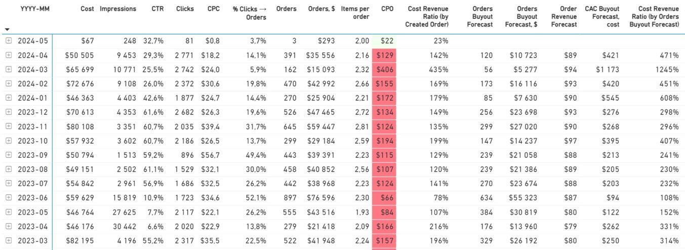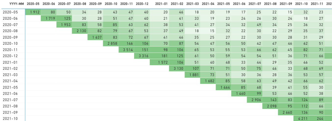 На скриншоте пример когорт: первая цифра слева — количество кликов, которые совершили люди из когорты. Цифры правее — продажи, которые случились вследствие клика, но спустя время