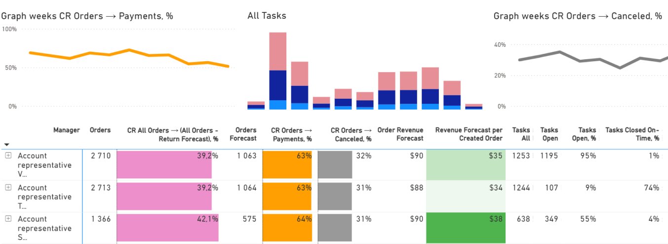В этом же отчёте находится прогноз, который помогает управлять всем циклом сделки. Как это работает: система показывает не только то, что уже случилось, например, продажи, которые состоялись, но и сколько продаж может произойти с учётом скорости конверсии и количества лидов.Отчёт большой и важный: со временем именно он становится единым источником точных цифр для всей компании.