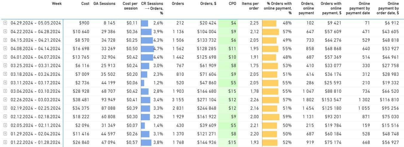 На скриншоте пример отчёта: в разбивке по неделям видны расходы, количество заказов по типу оплаты и дате оформления