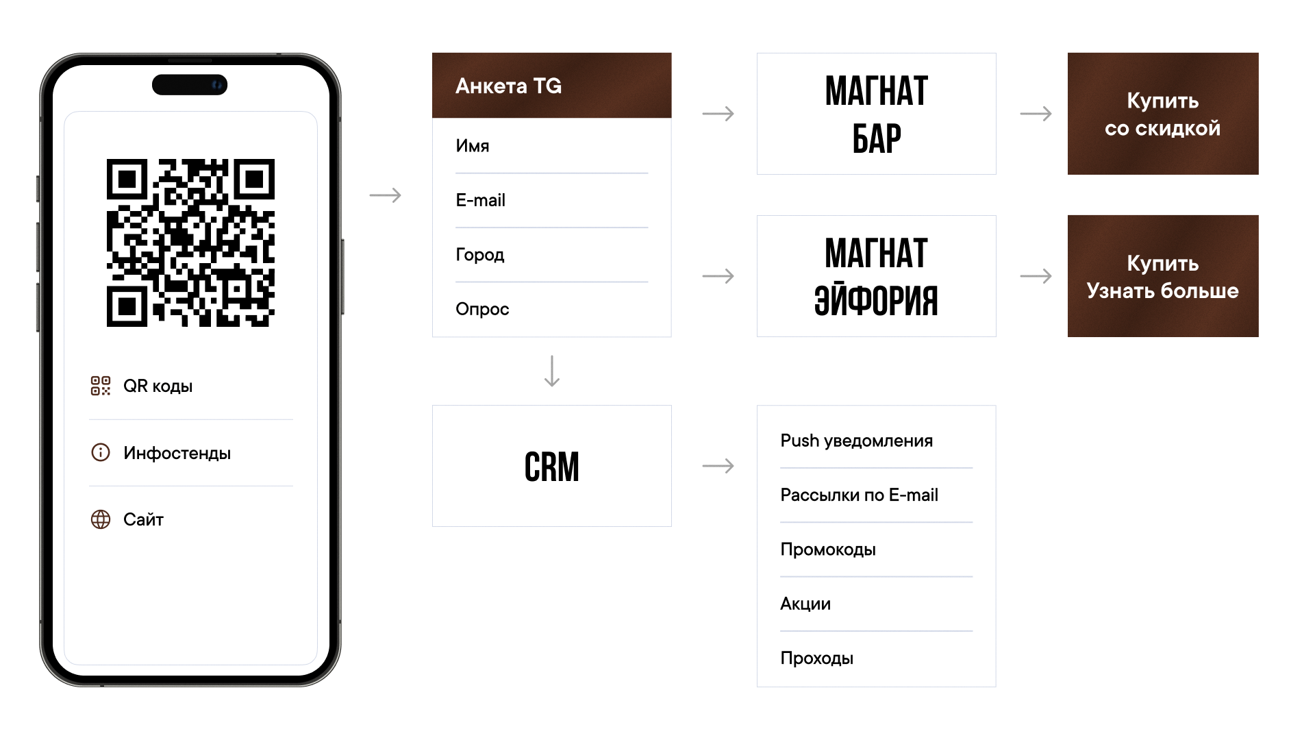 Пользовательские данные попадают в CRM и веб-админку мини-приложения. В будущем с ними можно работать: например, чтобы отправлять «догоняющие» или «реанимирующие» push-уведомления в Телеграм, сегментировать базу и запускать email-рассылку.