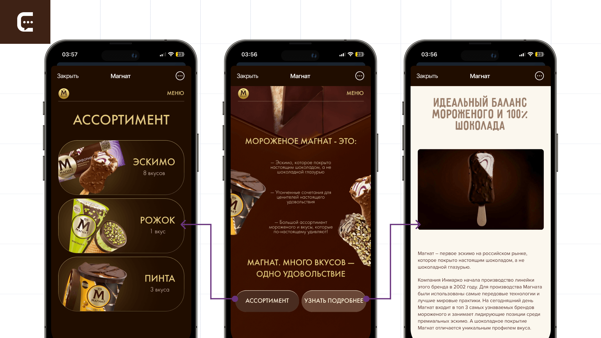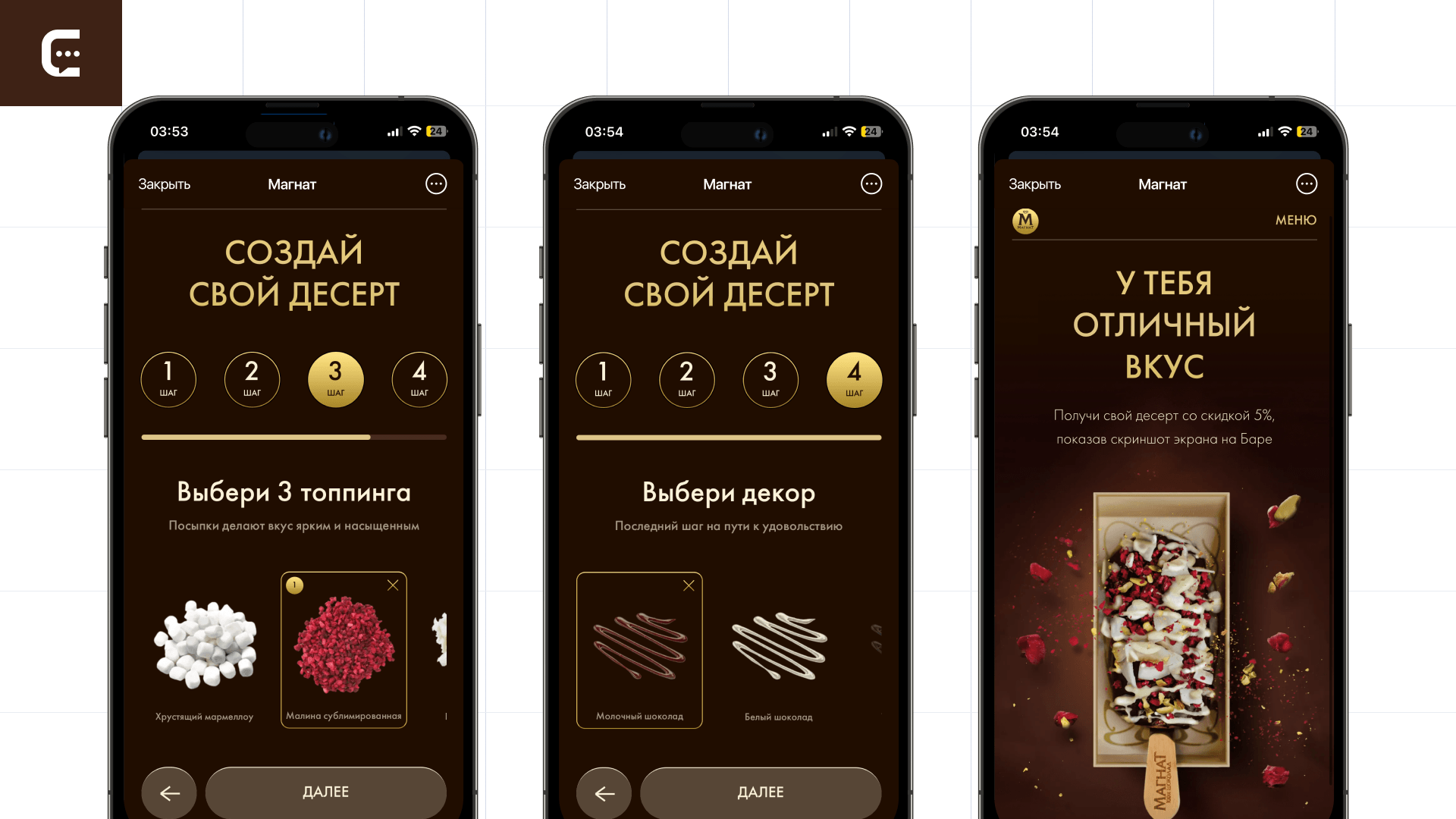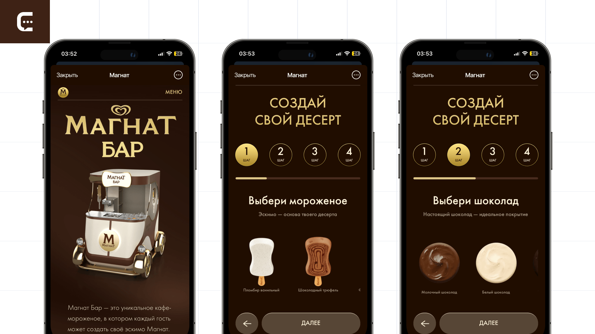 «Магнат Бар» — меню, где за 4 шага пользователь собирает собственное мороженое. Делается это на основе персональных предпочтений: одни любят эскимо без глазури, а другим нравится шоколад в шоколаде, покрытый шоколадом. Механика создания десерта в мини-приложении подразумевает 4 шага, пройти которые можно за 30 секунд: