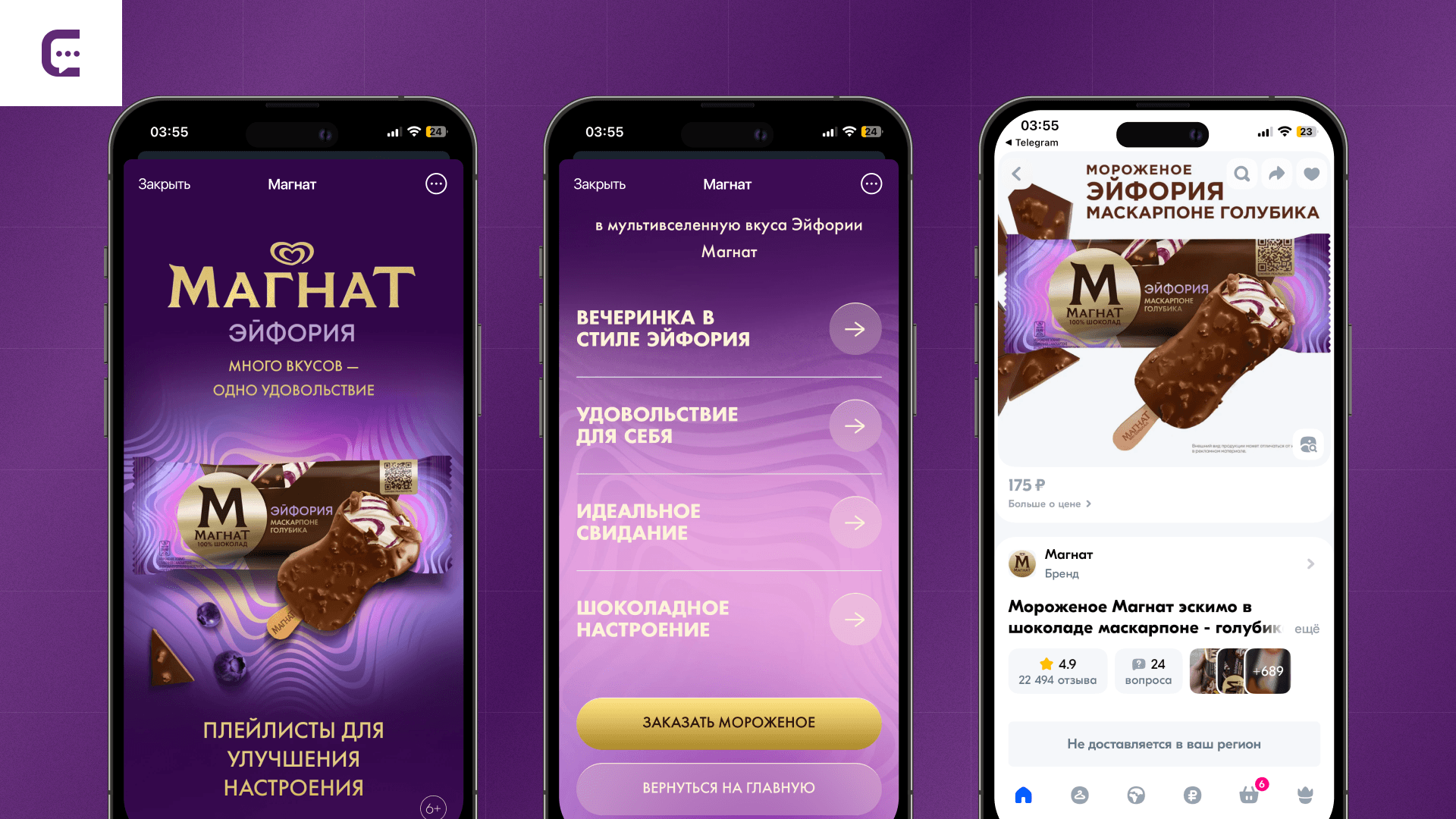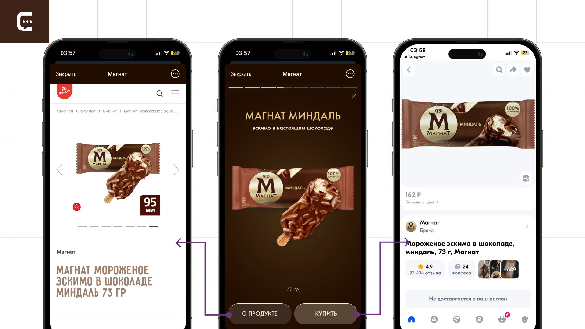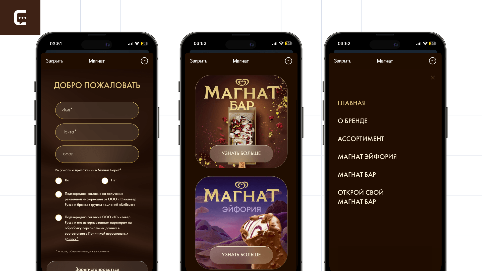 «Магнат Бар» — меню, где за 4 шага пользователь собирает собственное мороженое. Делается это на основе персональных предпочтений: одни любят эскимо без глазури, а другим нравится шоколад в шоколаде, покрытый шоколадом. Механика создания десерта в мини-приложении подразумевает 4 шага, пройти которые можно за 30 секунд:
