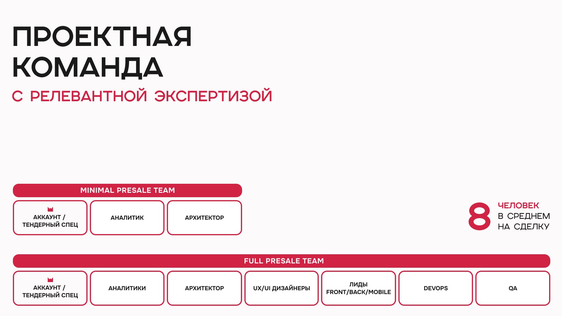 Есть проекты, которые проходят все этапы до заключения договора за 3-6 месяцев, но бывают и “марафонские дистанции”. За пять лет работы с одним из клиентов мы провели 17 встреч с разными ЛПР, участвовали в 5 тендерах, перерабатывали смету 9 раз. Каждый пресейл превращался в самостоятельный мини-проект с собственной командой и артефактами.