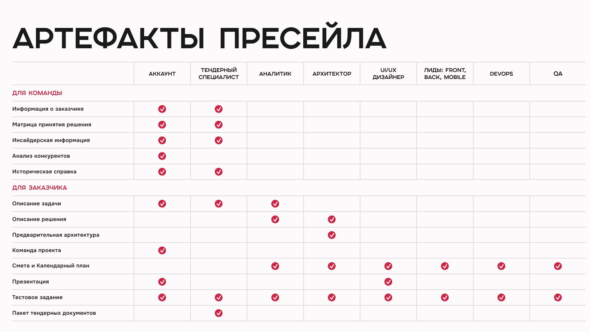 После успешного пресейла весь массив знаний фиксируется в паспорте проекта — рабочем документе для всей команды: информация о клиенте, договорённости (вплоть до деталей коммуникаций), матрица коммуникаций и все артефакты пресейла.
