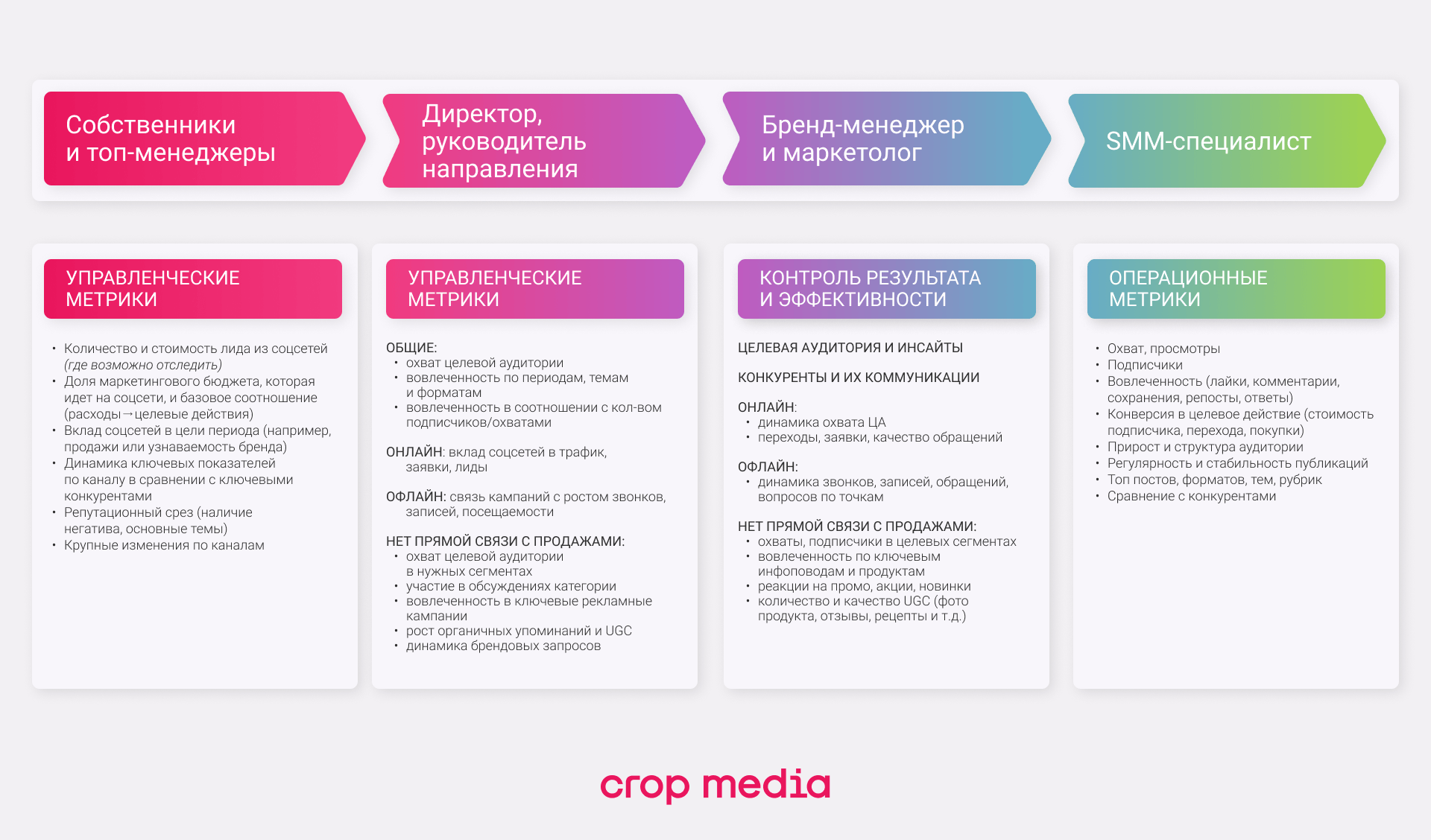 Отслеживается управленческий уровень метрик: количество и стоимость лида из соцсетей (где возможно), вклад соцсетей в продажи или узнаваемость бренда, динамика ключевых показателей, репутационные риски и крупные изменения по каналам.