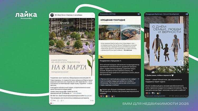 Соцсети — это должны быть не столько про квартиры, сколько про людей. Праздники, локальные события, памятные даты — отличный повод быть рядом. Контент, в котором есть тёплое отношение к аудитории, создает ощущение заботы, близости и уважения. Это неформальный, но важный канал укрепления эмоциональной связи с будущими жильцами.
