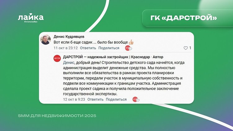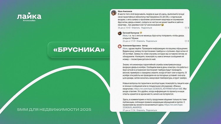 «Какой бы ни был хороший застройщик, всё равно могут возникать ситуации, которые пугают или настораживают подписчиков. Например, какие-то изменения в проекте. В таких случаях мы запрашиваем официальный комментарий у представителя застройщика – узнаем причины произошедшего, уточняем плюсы/минусы – и выстраиваем стратегию дальнейшей коммуникации. Главное правило – не отмалчиваться и не оставлять подписчиков без информации. Такой подход помогает выстроить доверительный диалог с нашей аудиторией», — Бондаренко Семен, руководитель проектов SMM-агентства «Лайка».