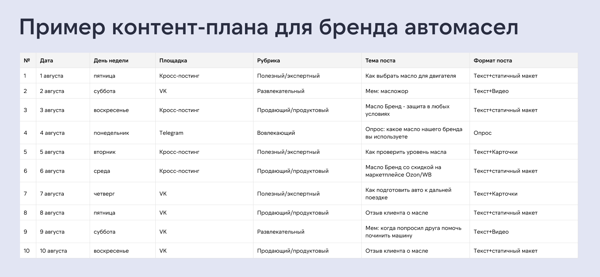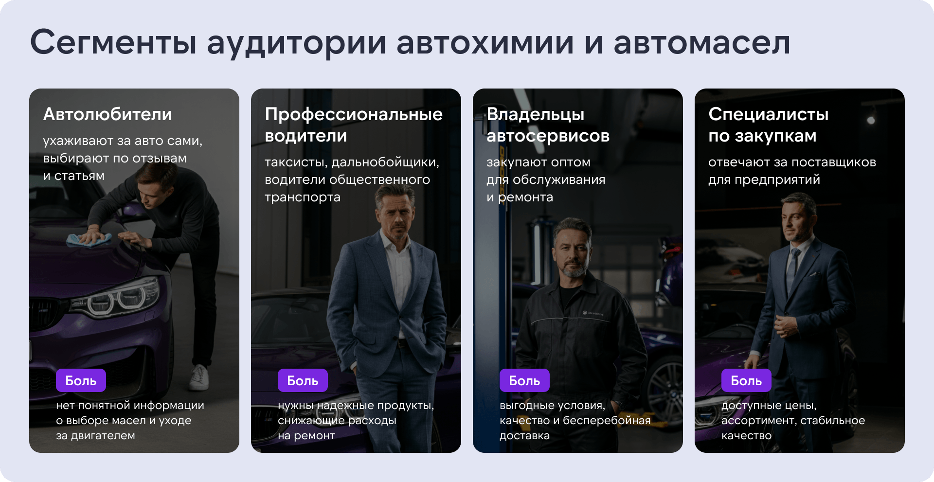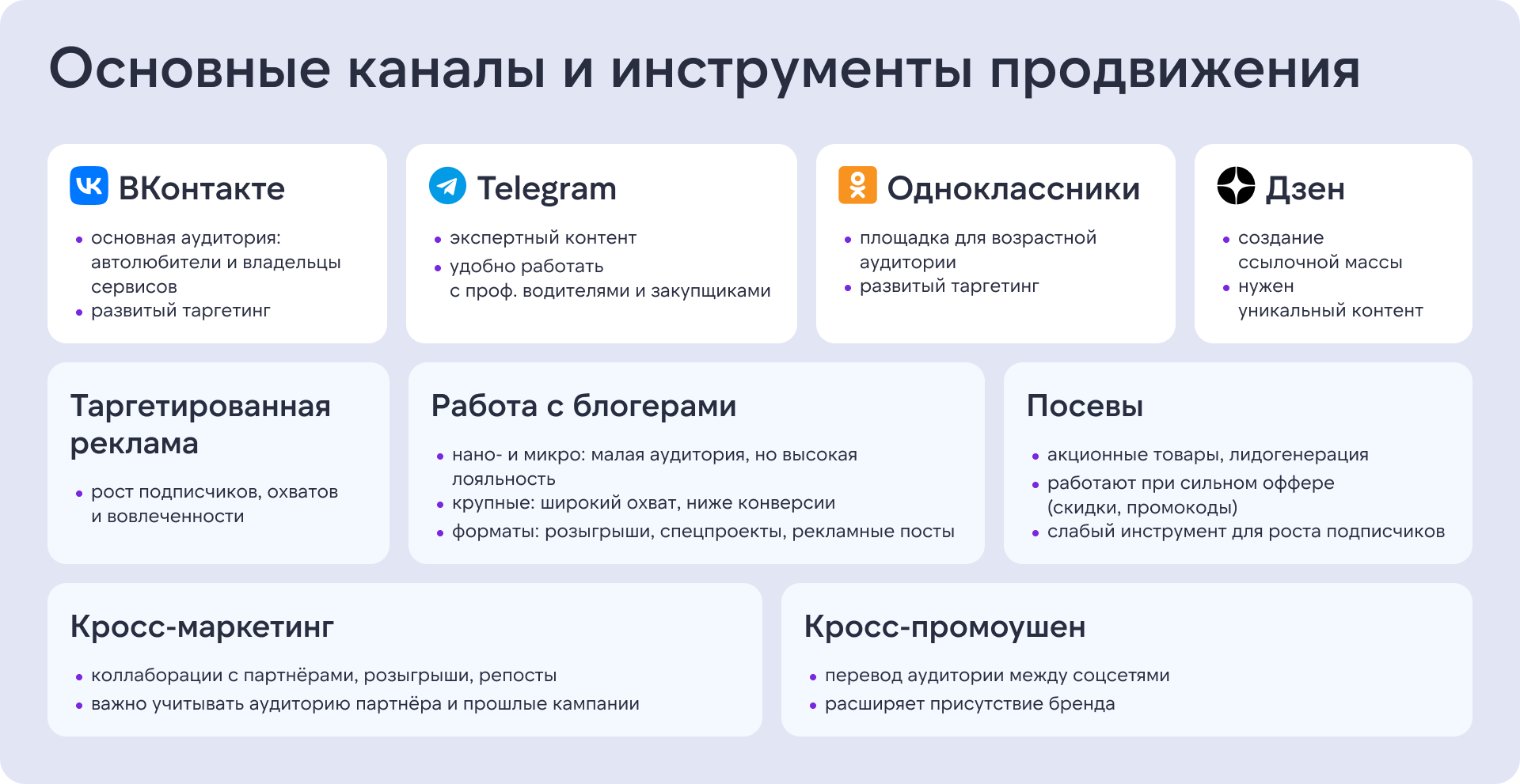 Органический рост и активность аудитории приходят не сразу, поэтому в начале стоит поддержать продвижение разными каналами. Выбор инструментов зависит от бизнес-целей и сезонности продукта, так как для ниши автохимии и масел это актуально.