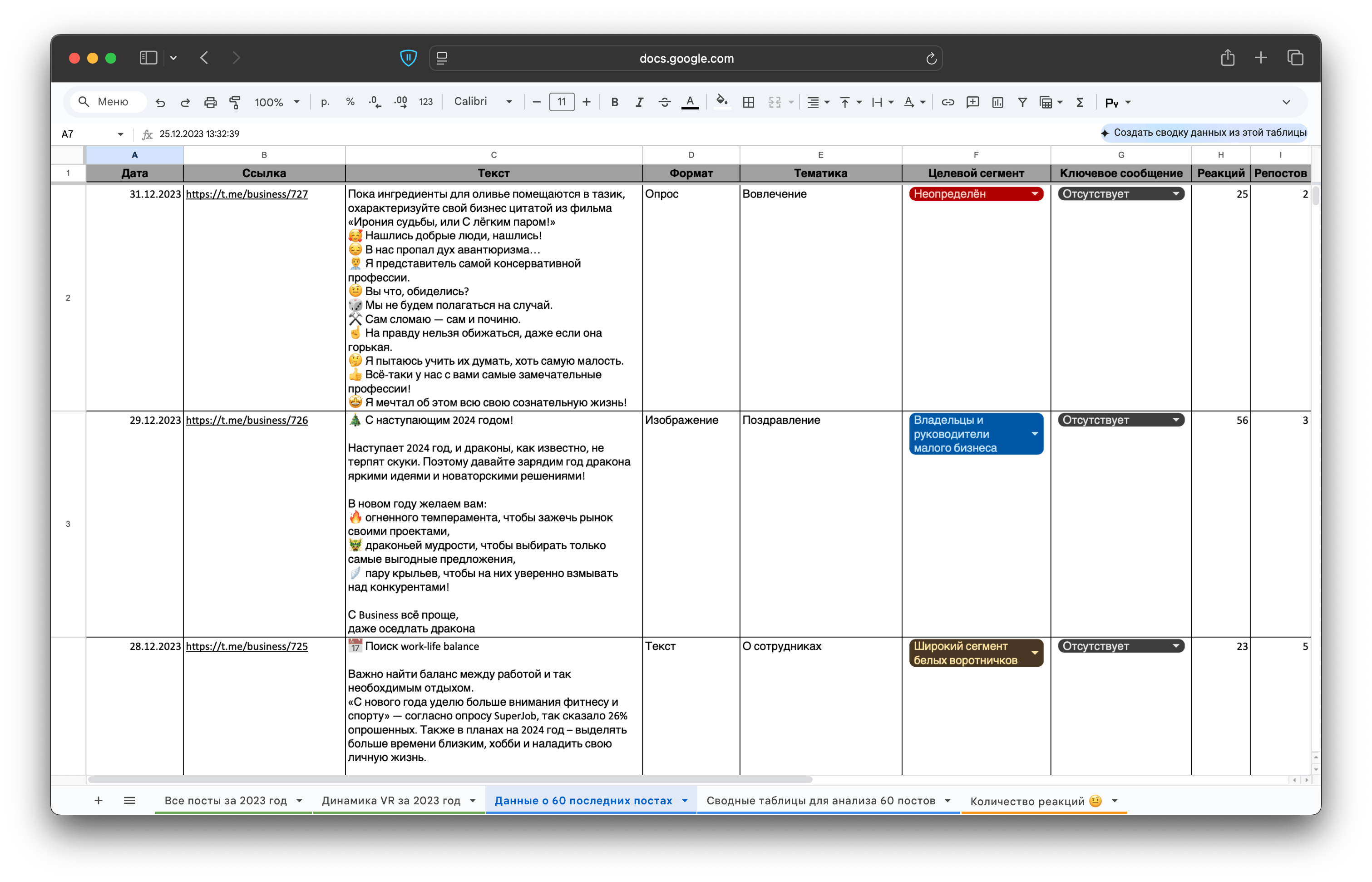 Всё то же самое можно сделать с помощью нейросети. Вы передаёте список атрибутов с пояснением, что каждый означает, выгружаете данные о постах из сервиса аналитики, например из LiveDune, вносите эти данные в нейросеть через документ и просите ИИ определить, какой из них транслируется в каждом посте. Такой способ сэкономит время, но всё равно потребуется ручная проверка, особенно если тексты сложные.