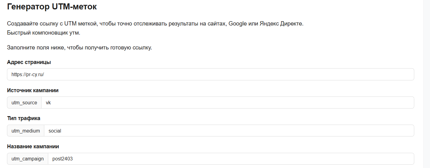 Если не хочется возиться с ручной настройкой, можно воспользоваться генератором UTM-ссылок онлайн. Здесь ещё есть параметр utm_campaign, который указывает на название рекламной кампании. Можете придумать любое, главное потом не забыть, к чему оно относится.