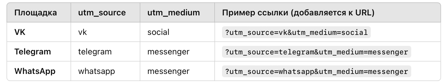 Такую ссылку можно составить вручную, добавив к адресу сайта нужные параметры. Чтобы не запутаться, удобно создать Google Таблицу с отдельными строками для каждой соцсети.