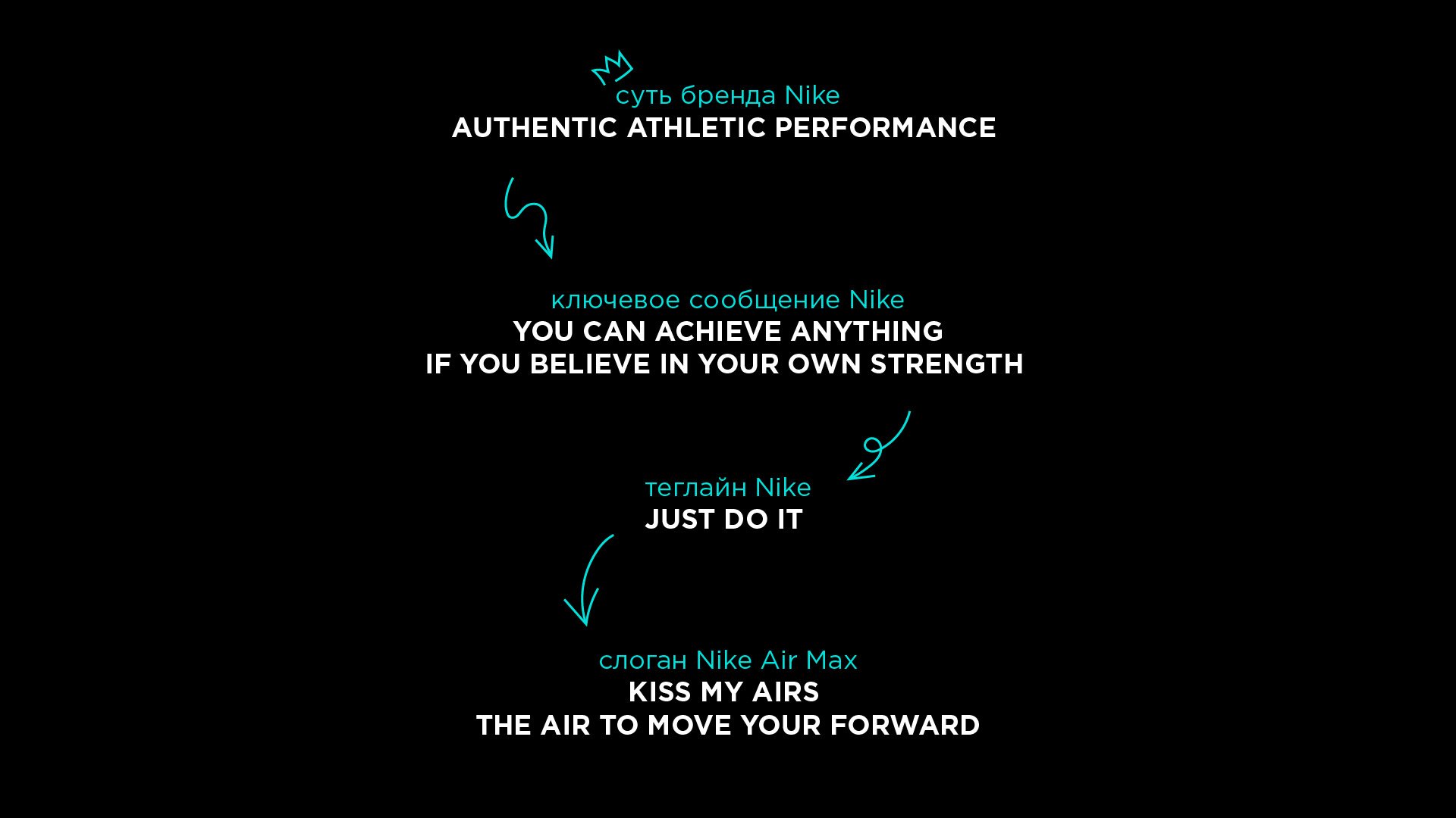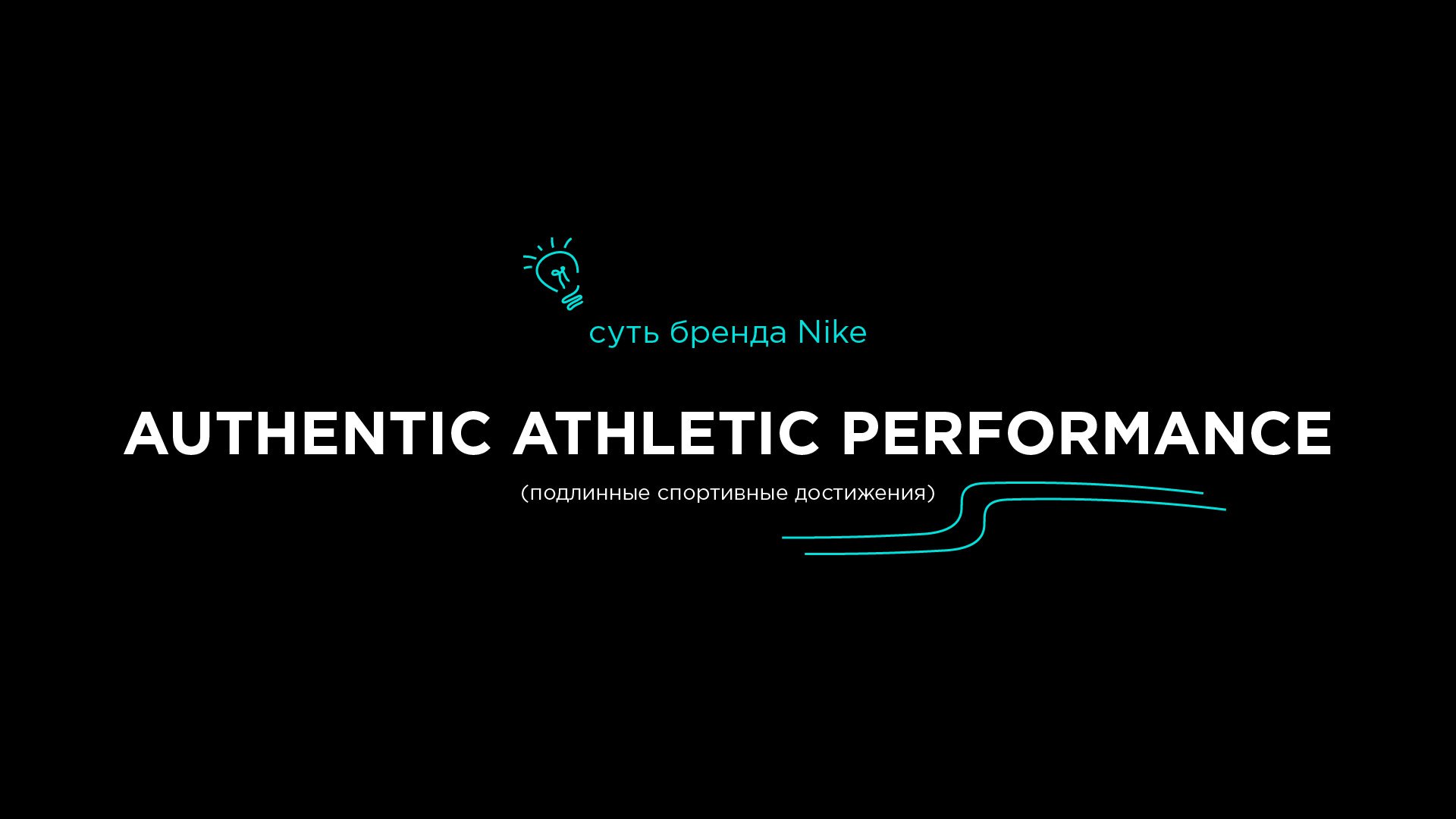 Например, Nike ― мотивирующий спортивный бренд, который уверен, что атлет ― это любой человек, у которого есть тело. Nike строится вокруг идеи о преодолении, помогает людям становиться лучше, сильнее, выносливее. Этот бренд ― про спортивные достижения, а не про расслабленный спорт в свое удовольствие. И ровно эта простая мысль сконцентрирована в сути.