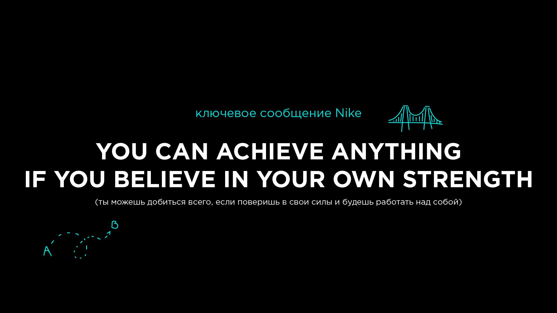 Nike в каждой рекламной кампании и каждом посте в соцсетях вдохновляет людей на достижения, придает энергии и уверенности. Если декодировать коммуникации бренда, его ключевое сообщение можно сформулировать так: «ты можешь добиться всего, если поверишь в свои силы и будешь работать над собой».