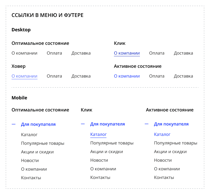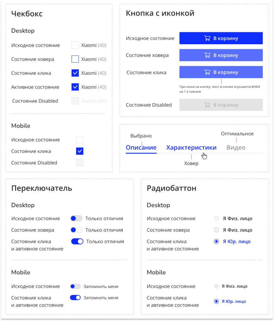 4. Для общих сквозных элементов сайта все состояния и ховеры должны быть отрисованы на эталонной странице. Для уникальных или очень редких элементов состояния и ховеры рисуются рядом с этим элементом прямо рядом с макетом.