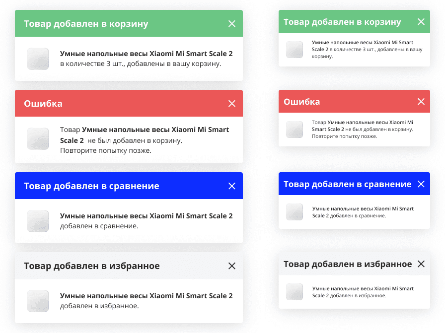 3. Показать дизайн нотификаторов добавления в корзину: успешно, возникли проблемы, ошибка.