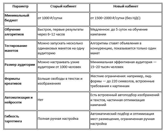 Старый и новый кабинеты ВКонтакте различаются не только интерфейсом, но и принципами работы алгоритмов, требованиями к креативам и возможностями тестирования.