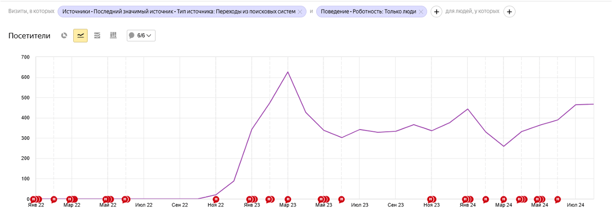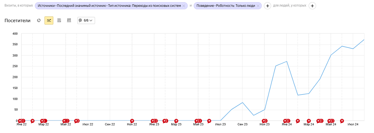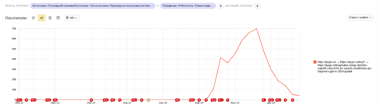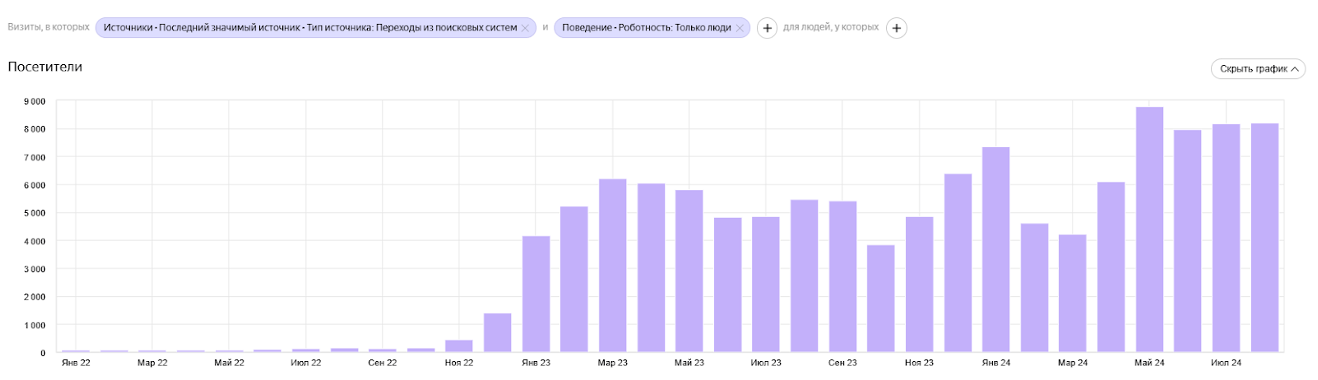 Август 2024-го был последним активным месяцем в плане наполнения статьями, весна 2023 – более активное наполнение коммерческого раздела. Проект, соответственно, стартап и на NDA.