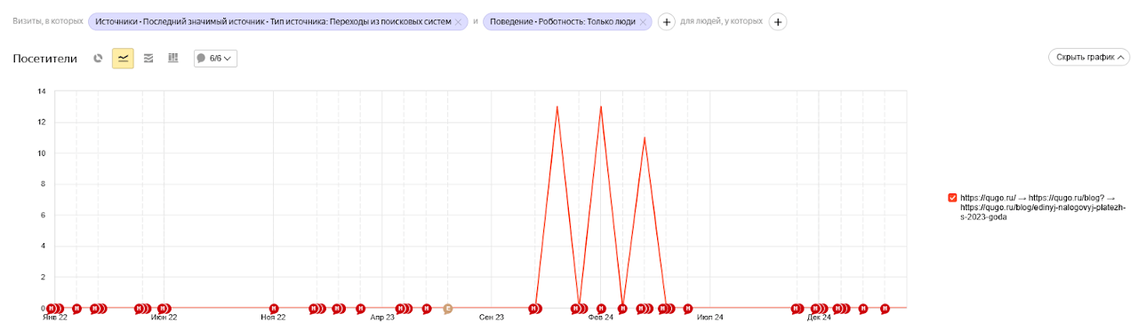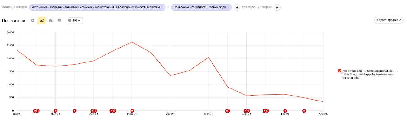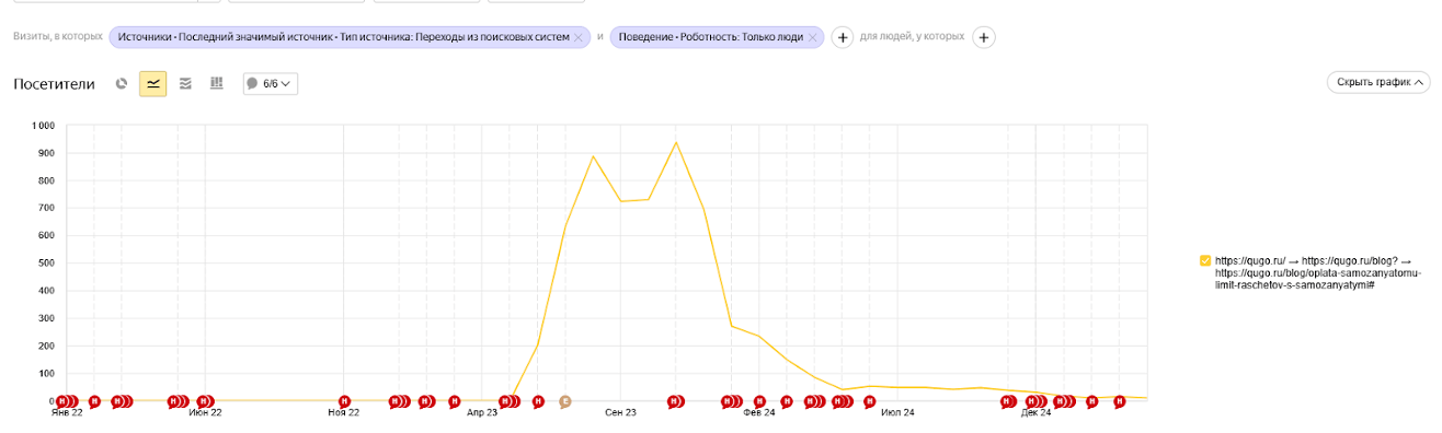 Достигнув пика, спустя 2 месяца статья стремительно теряет актуальность. Что интересно, данные, приведенные в статье актуальны по сей день, несмотря на то, что они не менялись с 2023 года. Однако, статья должна стать той самой хроноспецифичной статьей, обновлять которую необходимо каждый год. Анализ выдачи показывает, что в данной теме в ТОП-5 находятся сайты с вхождением фразы «2025».