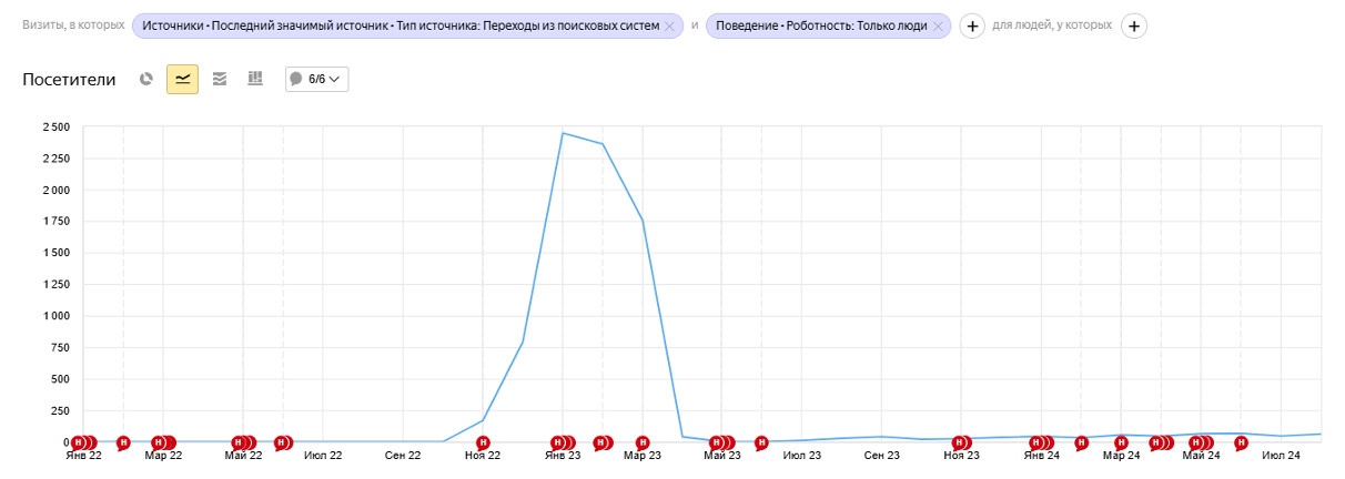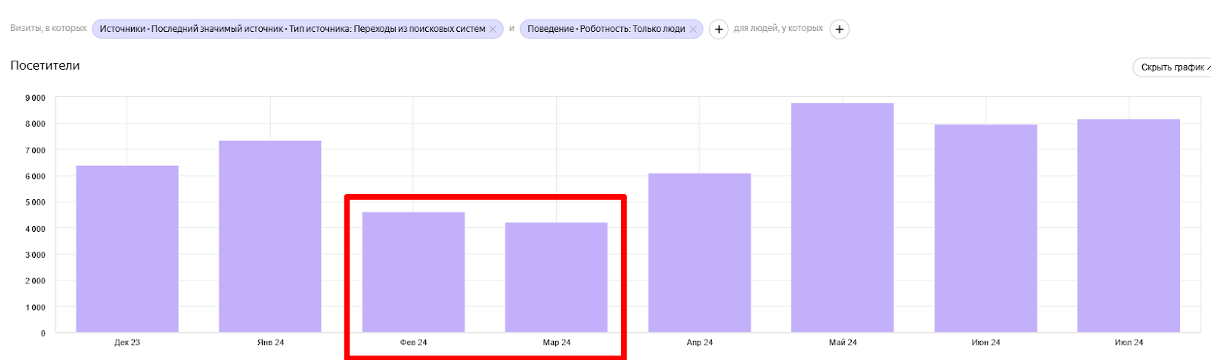 Никогда нельзя останавливаться. Ниже рассмотрим наглядный пример, когда после нескольких месяцев активной публикации вдруг наступает пауза – трафик теряется существенно.