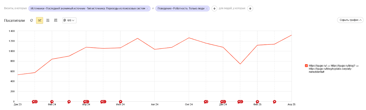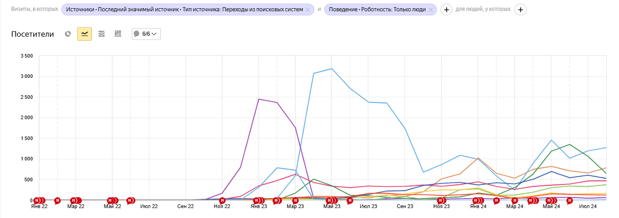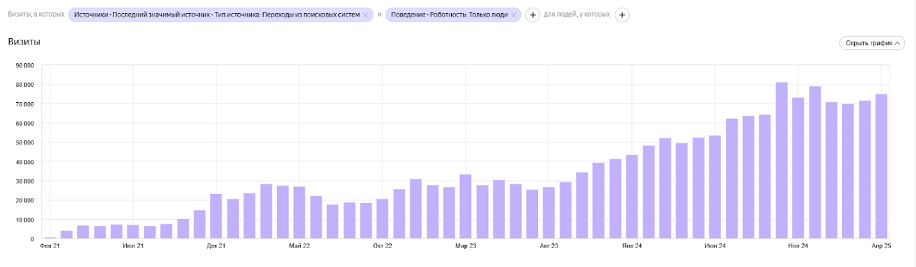При этом, важно отметить качественную редактуру, профессиональные замечания и внедрение некоторых тем клиентом – без этого было бы сложно добиться успехов в статейном и коммерческом YMYL сегменте данного проекта.