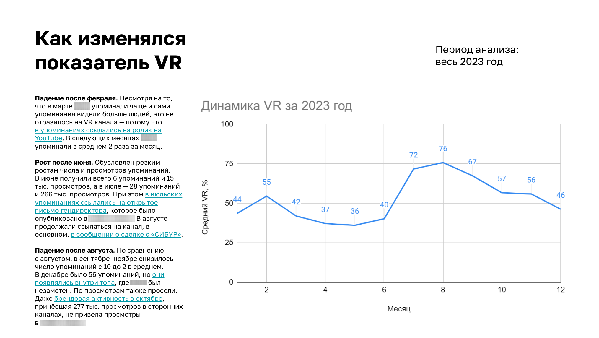 Итак, VR — это косвенный, но очень наглядный маркер интереса. Он показывает, насколько люди мотивированы заходить в канал и читать посты. Рассчитывается по нехитрой формуле: