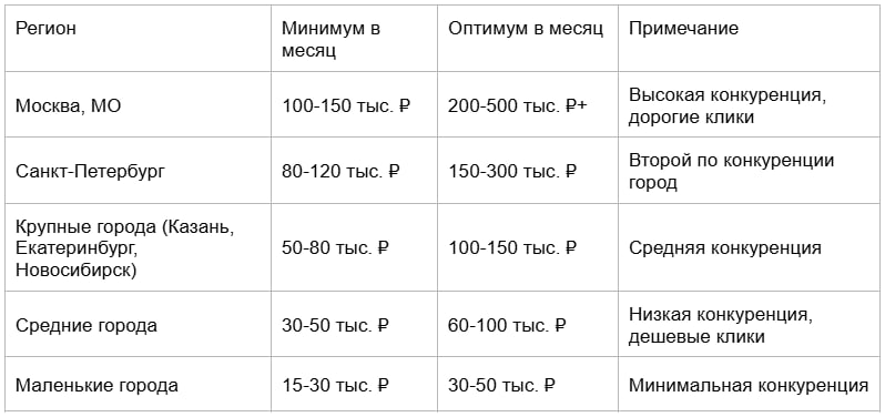«Запущу на 10-15 тысяч, посмотрю результаты». За эту сумму вы получите 150-400 кликов (в зависимости от ниши). Конверсии может вообще не быть, потому что мала выборка. Минимум для нормального тестирования: 30-50 тысяч рублей.