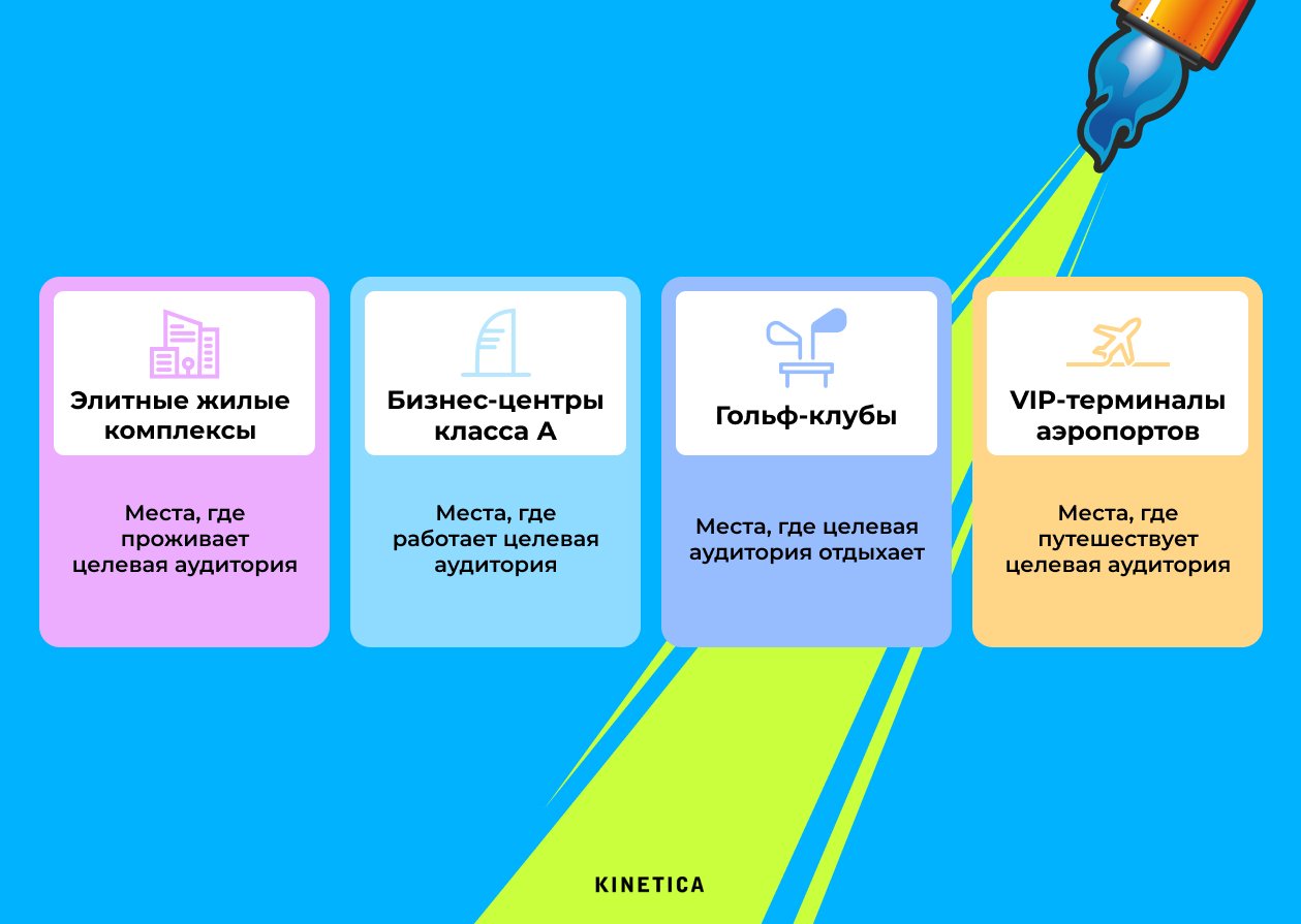 Гиперлокальный таргетинг: пожалуй, самый честный инструмент. Мы не гадаем по интересам в профиле, а идём туда, где наша аудитория физически проводит время: элитные жилые комплексы, бизнес-центры класса А, гольф-клубы, VIP-терминалы аэропортов. География не врёт. Мы в агентстве решаем эти задачи через большое количество гиперлокальный таргетов в местах потенциального присутствия целевой аудитории и это показывает блестящий результат.