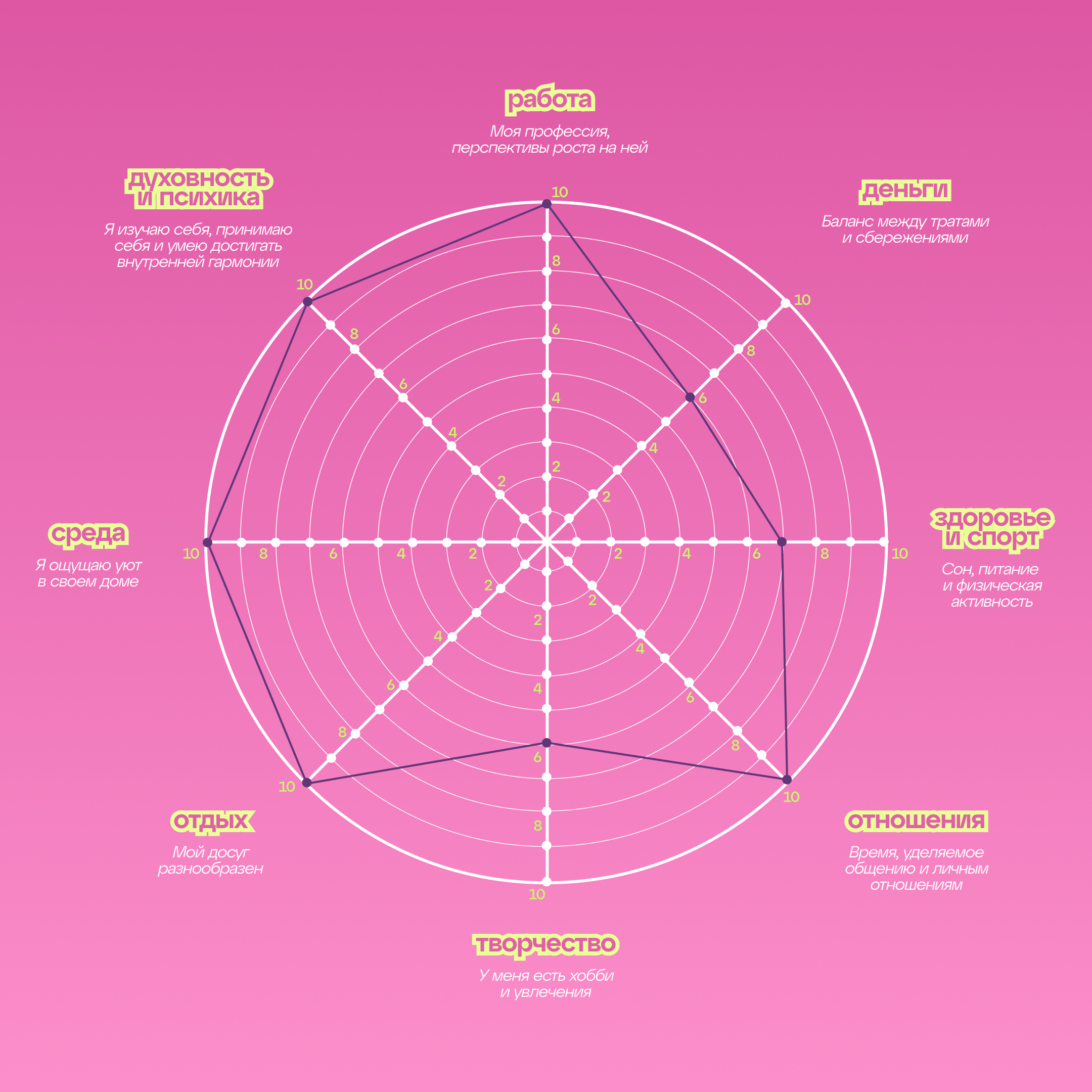 Мы в "Метрике", например, делали "Колесо баланса" — метод визуального самоанализа, разработанный американским бизнесменом и коучем Полом Майером. Эта техника помогает наглядно увидеть, какие сферы вашей жизни требуют внимания.