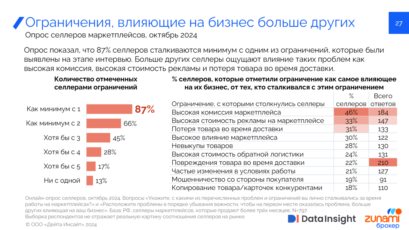 Завершить список можно исследованием от агентства Data Insight. Посмотрите, с какими трудностями чаще всего сталкиваются селлеры на маркетплейсах. Здесь и то, что мы уже перечислили, и несколько новых пунктов.Результаты опроса селлеров от Data Insight