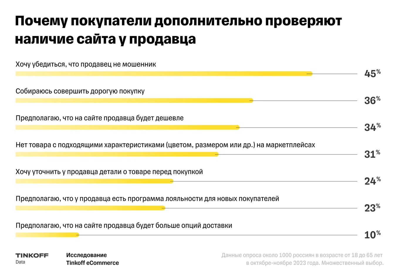 Согласно исследованию Tinkoff eCommerce, 75% покупателей маркетплейсов дополнительно ищет сайт продавца по совершенно разным причинам: защита от мошенничества, желание купить товар подешевле или приобрести другой вариант товара. Значит, если сайта у продавца не будет, клиент скорее сделает выбор в пользу конкурента с собственной площадкой. Особенно если там можно найти более выгодное предложение или удобную программу лояльности.