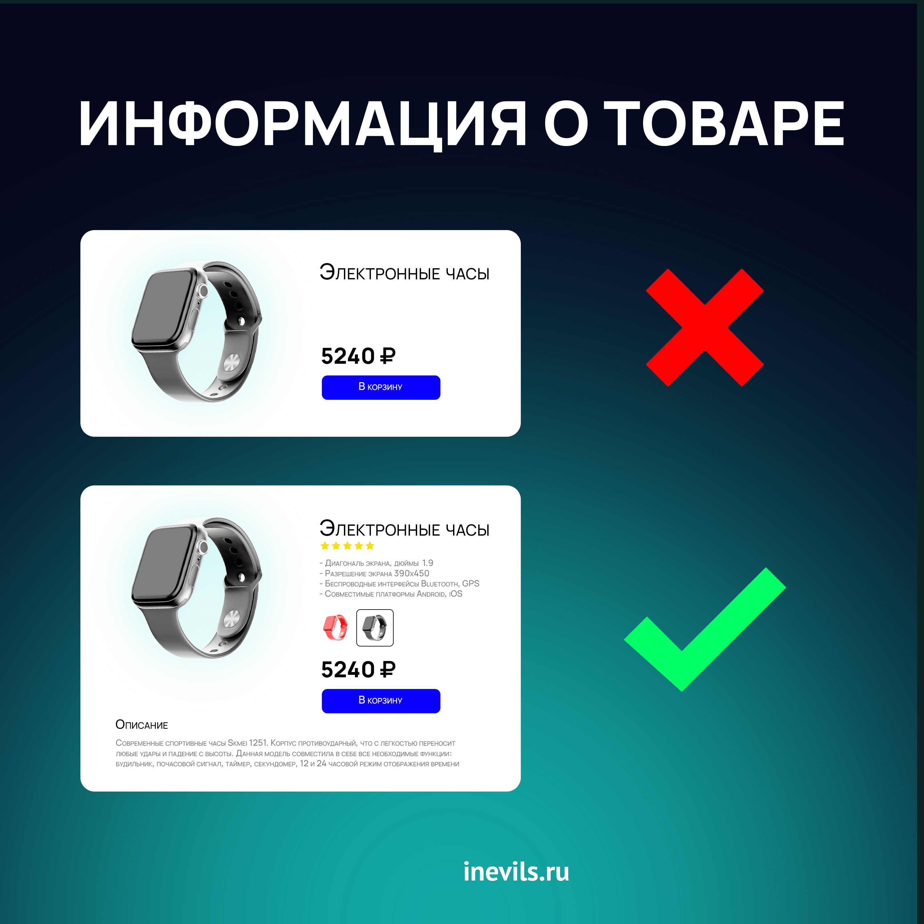 Перед вами — пример того, как надо и как не надо оформлять карточки товаров в интернет-магазине. Идеальное описание товара включает: