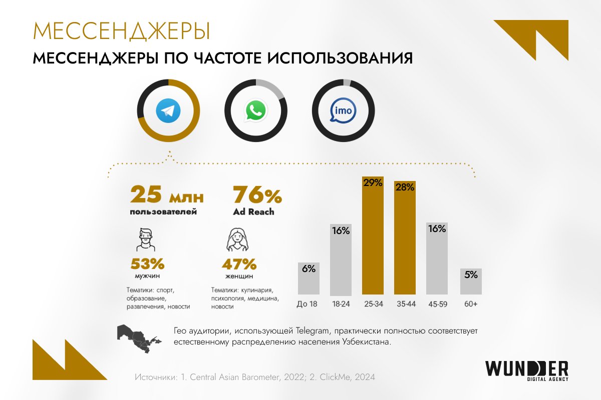 Telegram — основной мессенджер в Узбекистане с охватом 25 млн пользователей, или 76% интернет-аудитории. Платформа доступна во всех регионах и является важным инструментом коммуникации, что делает ее незаменимой в медиамиксе рекламных кампаний.