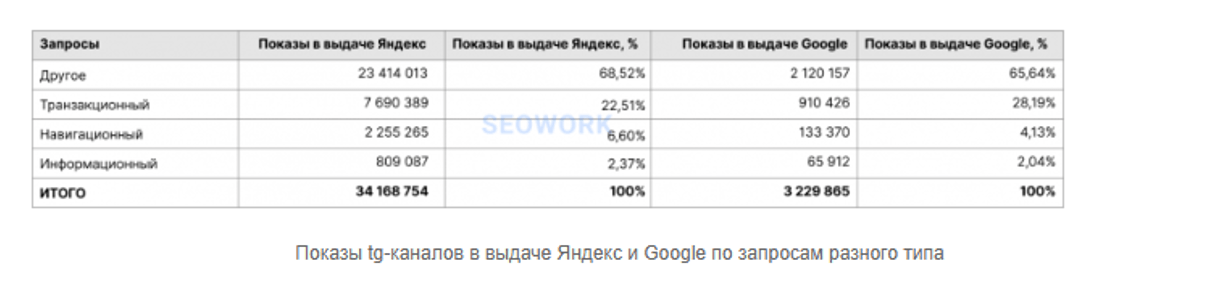 Какие запросы чаще всего ведут на ТГ-каналы? По данным исследования, в топе первых показов Яндекса ТГ появляется по транзакционным запросам — когда пользователь ищет товар или услугу без привязки к бренду (например, “купить диван”).