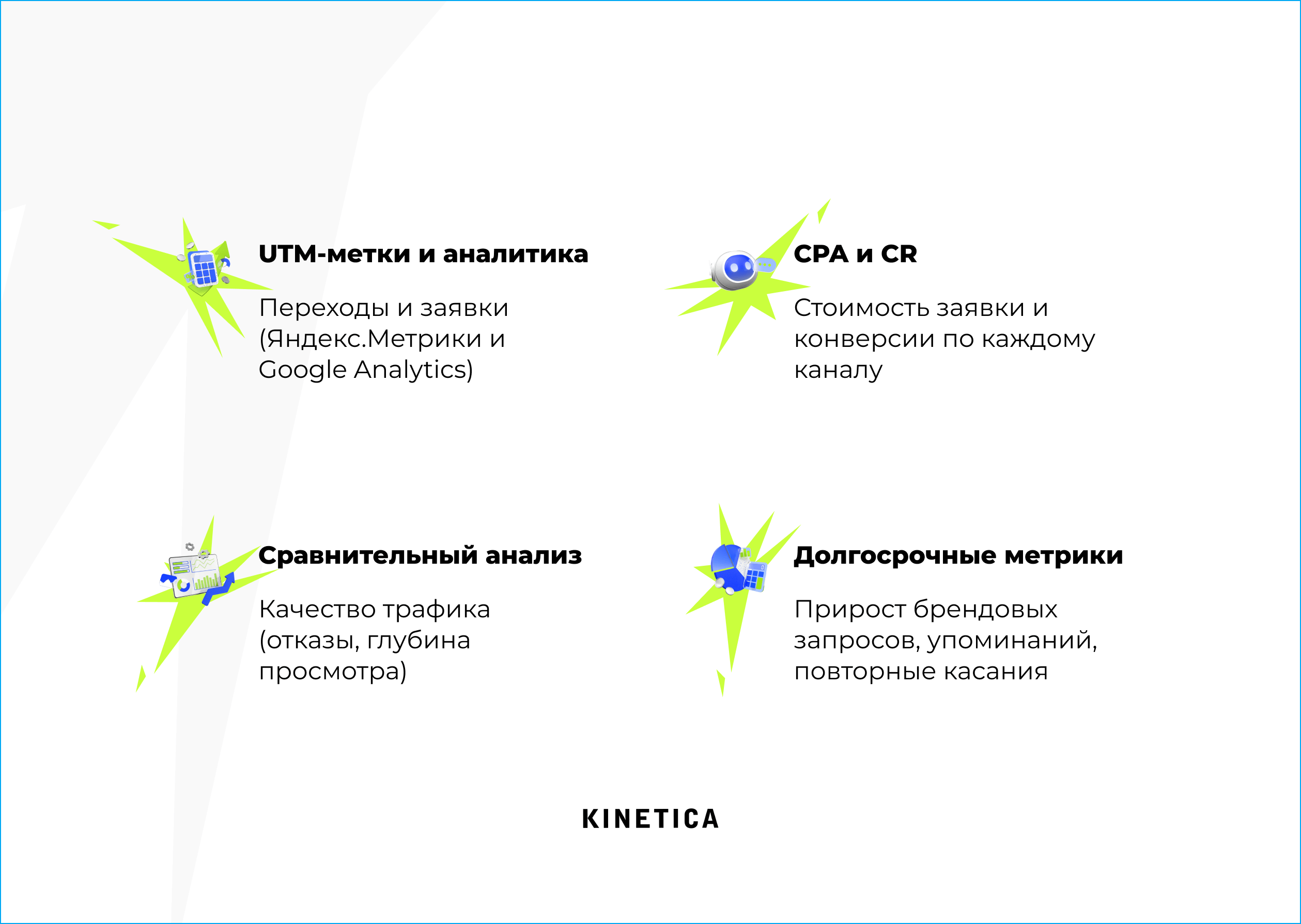 После запуска выгружаем UTM-метки в Excel и сравниваем каналы по CR, стоимости клика и глубине просмотра. В одной из кампаний разброс CR был от 0,4% до 4,2%. Канал с лучшей конверсией остался в списке для повторных запусков, остальные — исключили.