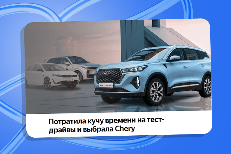 В мае мы запустили промостраницы на чат-лендинг клиента - официального дилера CHERY. Для этого мы подготовили серию статей от первого лица. В них рассказывали, какой путь проходит герой перед покупкой автомобиля и почему выбирает Chery. Подача в формате личного опыта позволила достичь большей нативности и, как следствие, вовлеченности аудитории.