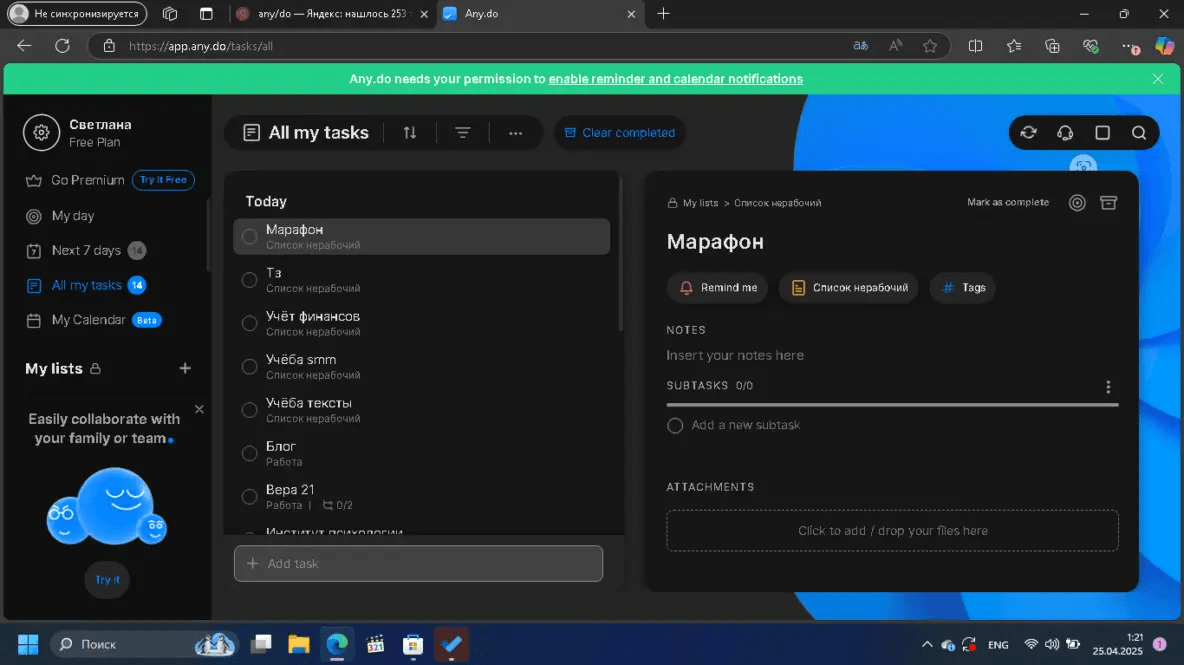В планировщике можно настроить напоминания и уведомления на конкретное время. Для часто повторяющихся задач вроде еженедельного созвона с командой можно установить регулярные напоминания. Есть синхронизация между устройствами: можно начать работать над списком задач на компьютере, а продолжить в смартфоне.