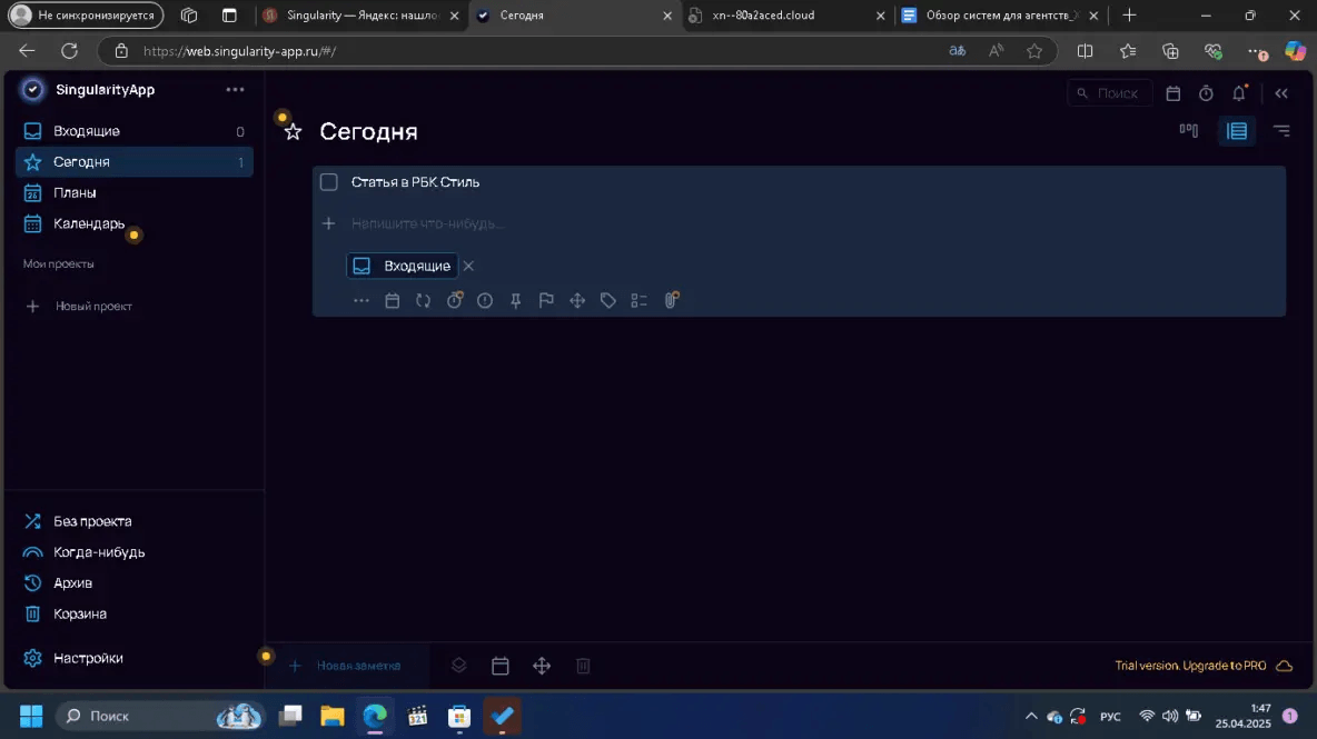 Лаконичный интерфейс с семью разделами. Новые задачи из почты и Telegram-бота автоматически попадают во «Входящие».