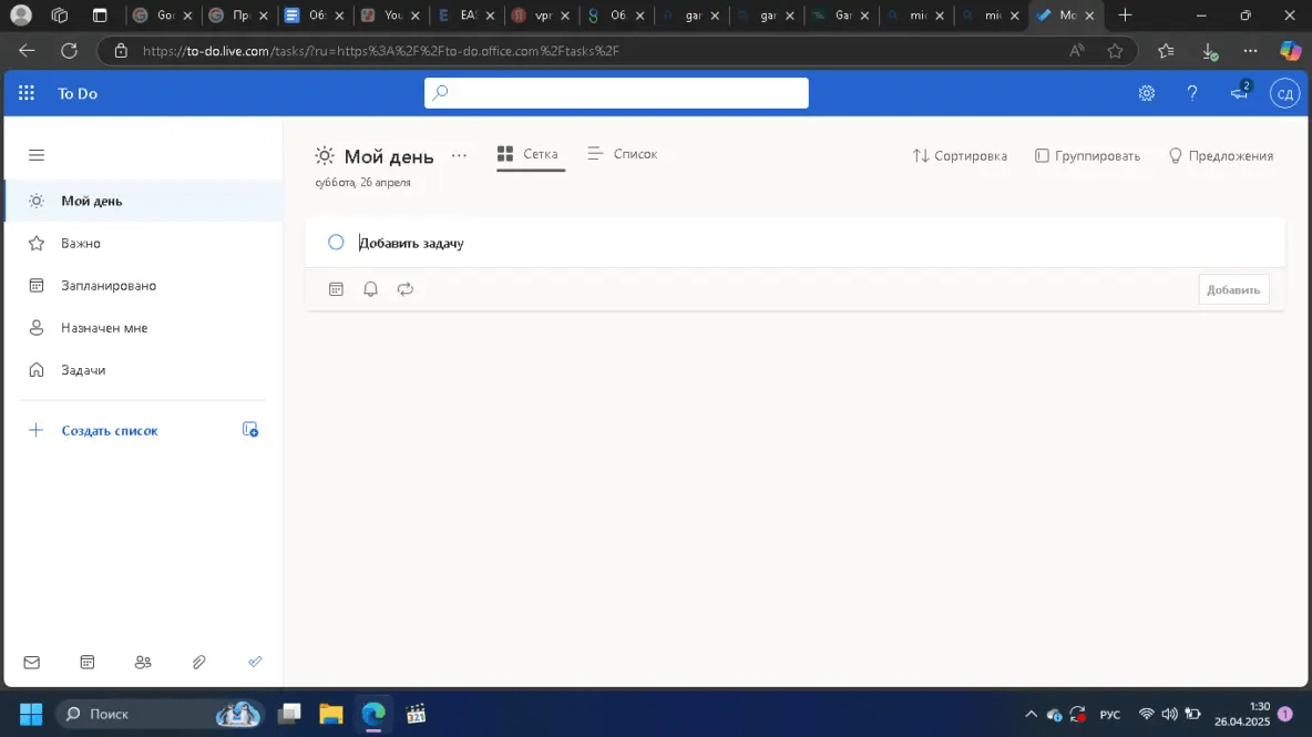 Чистый интерфейс без сложных настроек: список дел, кнопка добавления задачи и несколько встроенных разделов вроде «Мой день».