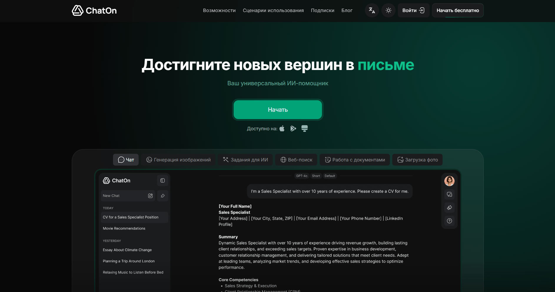 Описание. ChatOn — это универсальный ИИ-ассистент в виде мобильного приложения, который объединяет в себе функции чат-бота, генератора текста и редактора. Он отлично подходит для быстрого написания небольших рефератов, эссе или докладов прямо с телефона.