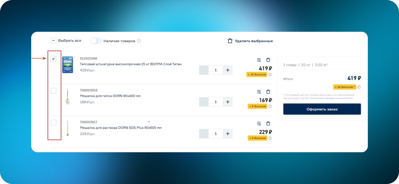 В корзине рядом с каждым товаром есть чекбокс. Пользователь может выбрать только нужные позиции для оформления, а итоговая сумма пересчитывается автоматически. Это удобно при больших заказах и помогает разбивать покупки на несколько этапов.